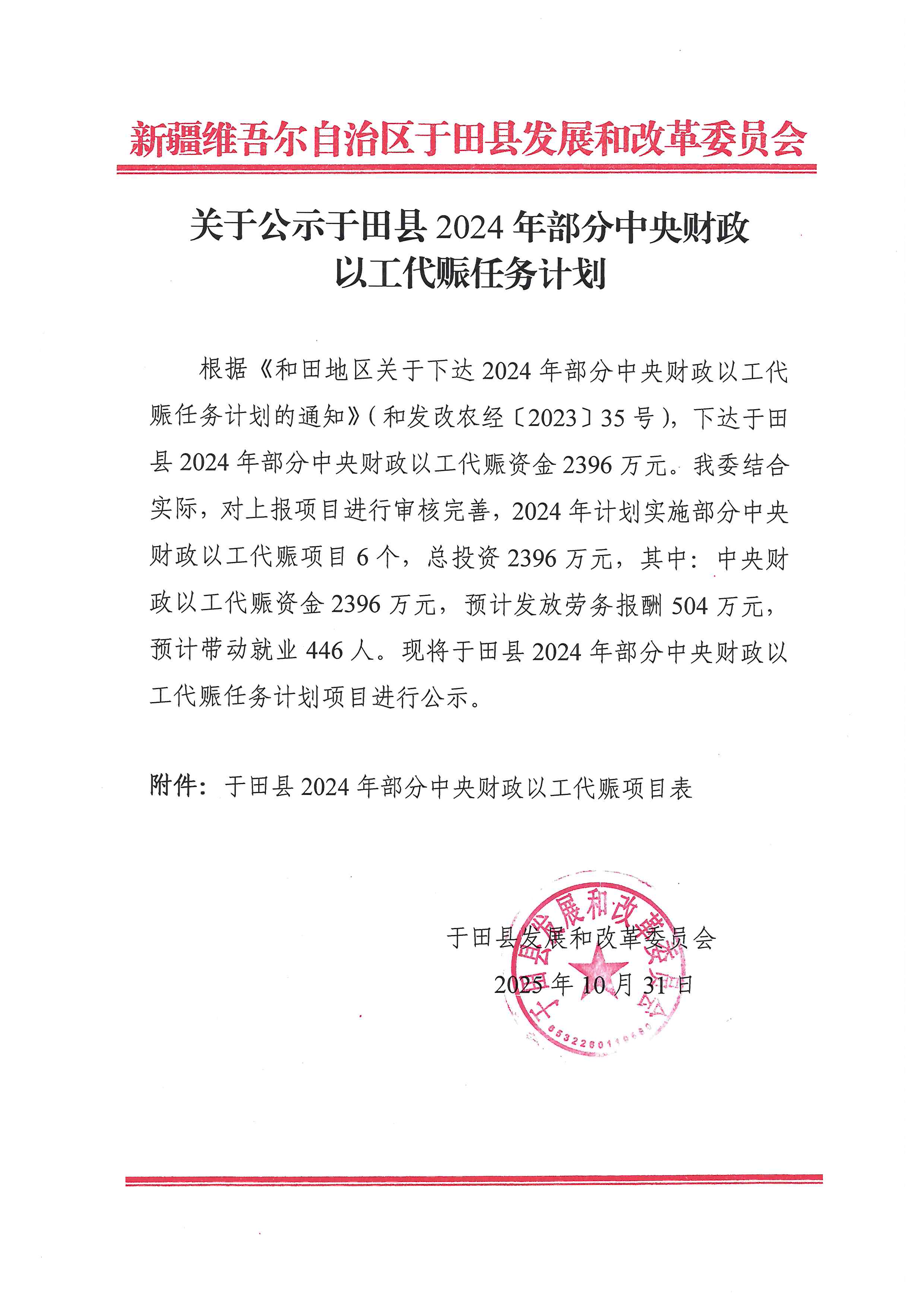 关于公示于田县2024年部分中央财政以工代赈任务计划